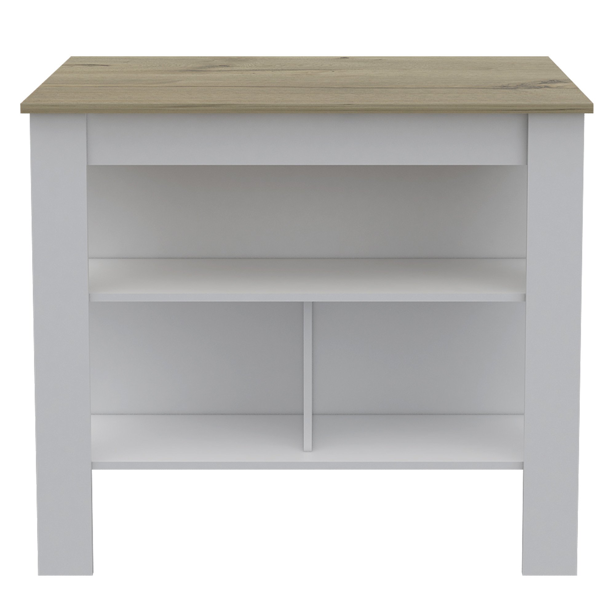 The TuHome Cala Kitchen Island brings style and functionality to your kitchen space. The large tabletop provides an open work area / display shelf. Below the tabletop; you will find one side with two shelves for additional storage space (12 In Height x 12 in Deep x 38 in Lenght). The bottom shelf is split into two equal sections; all of them are perfect for displaying any decor; pots; pans or having kitchen utensils handy when you need them; The other side is designed to be a working station where you can sit with leg room to confortably prep your meals. This two-tone finished piece is sure to draw the attention of your guests. Product Dimensions: 35.4 H x 40.5 W x 27.5 D